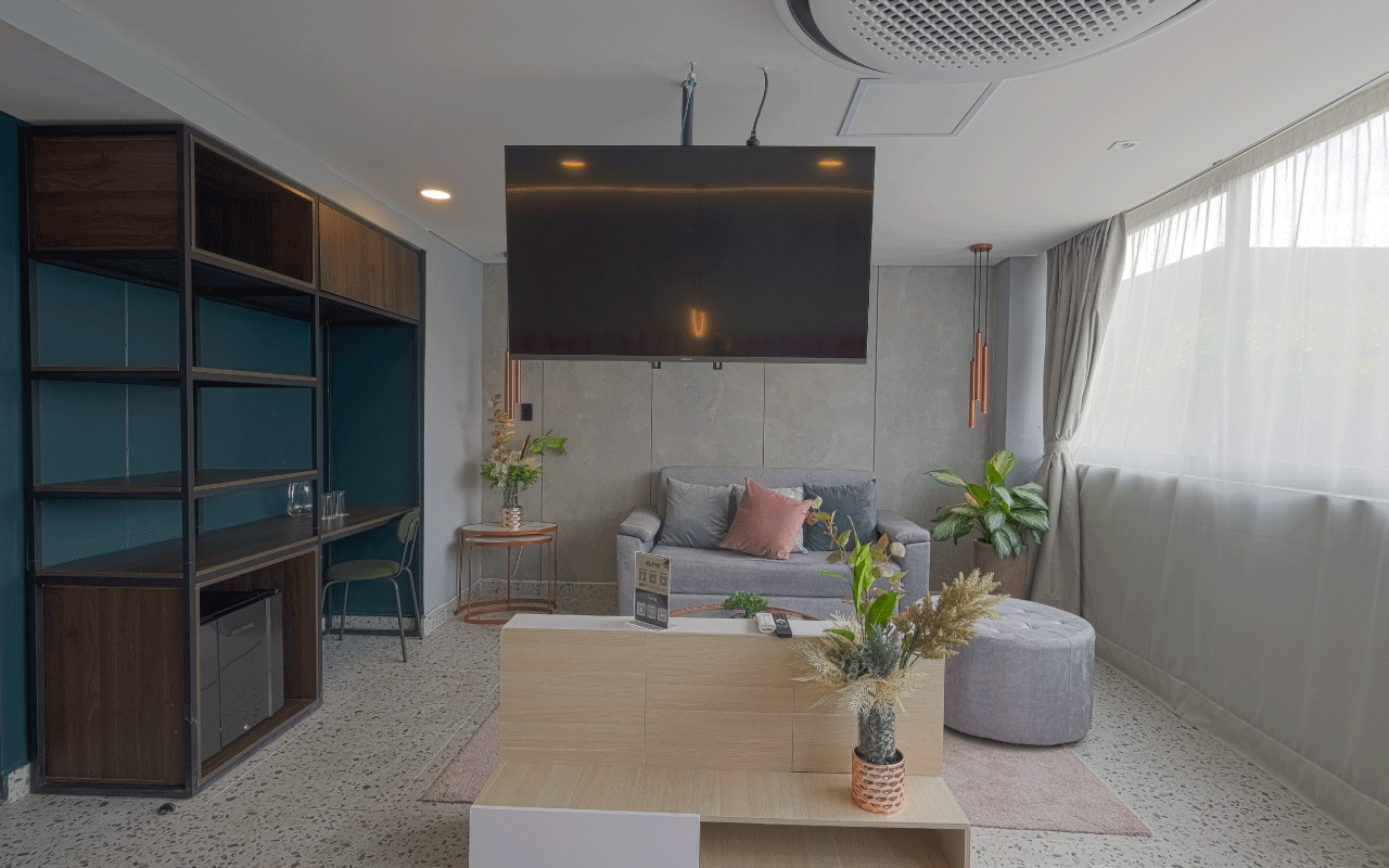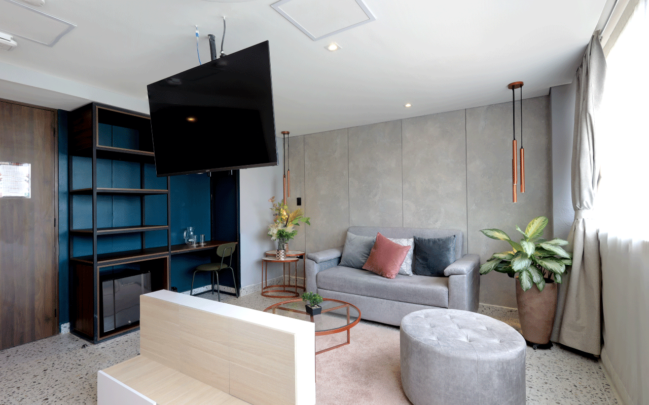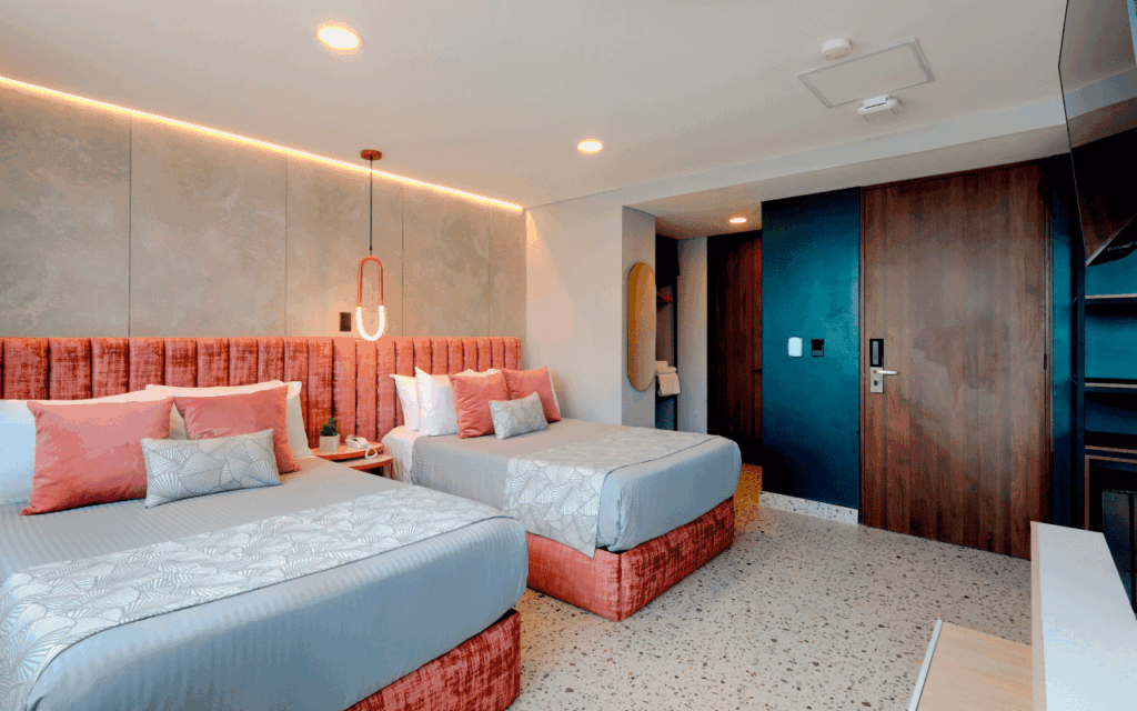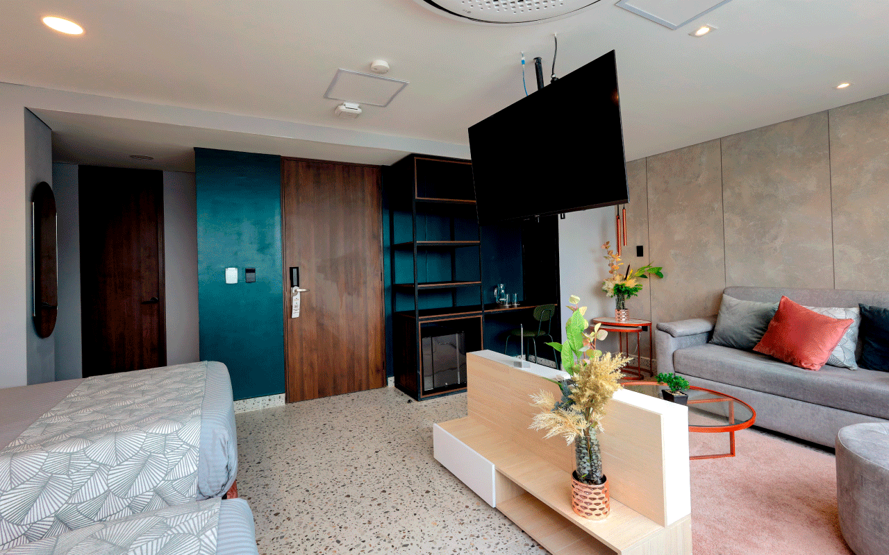 Our 34 m² Junior Suite is ideal for sharing with friends, with a maximum capacity of 2 guests. It offers two semi‑double beds, a comfortable living area with a double sofa bed, a wall‑to‑wall unit with integrated desk, a bathroom featuring luxury fixtures, an ice‑glass shower, terrazzo‑style flooring, and modern finishes in vibrant colors
