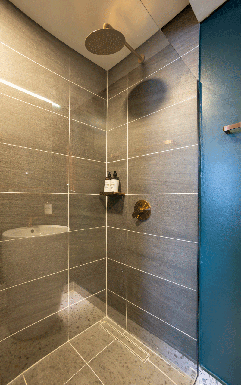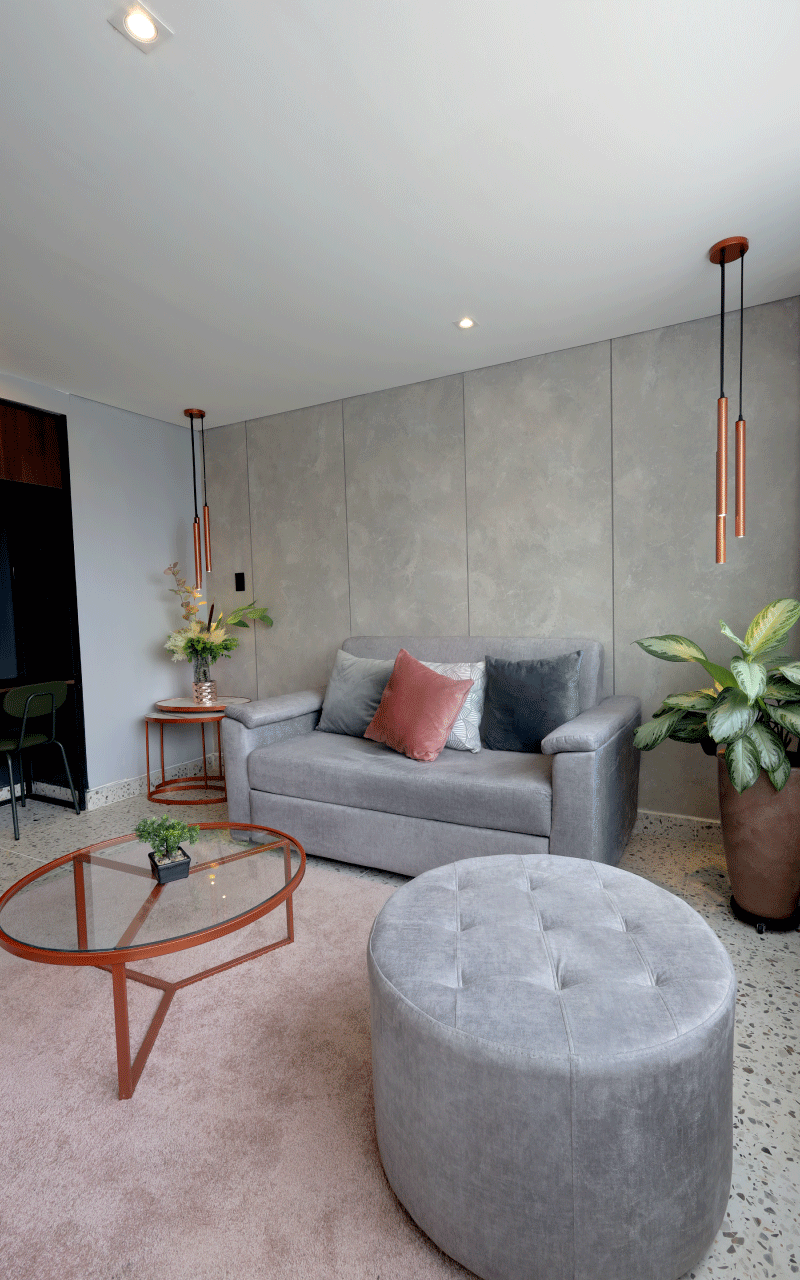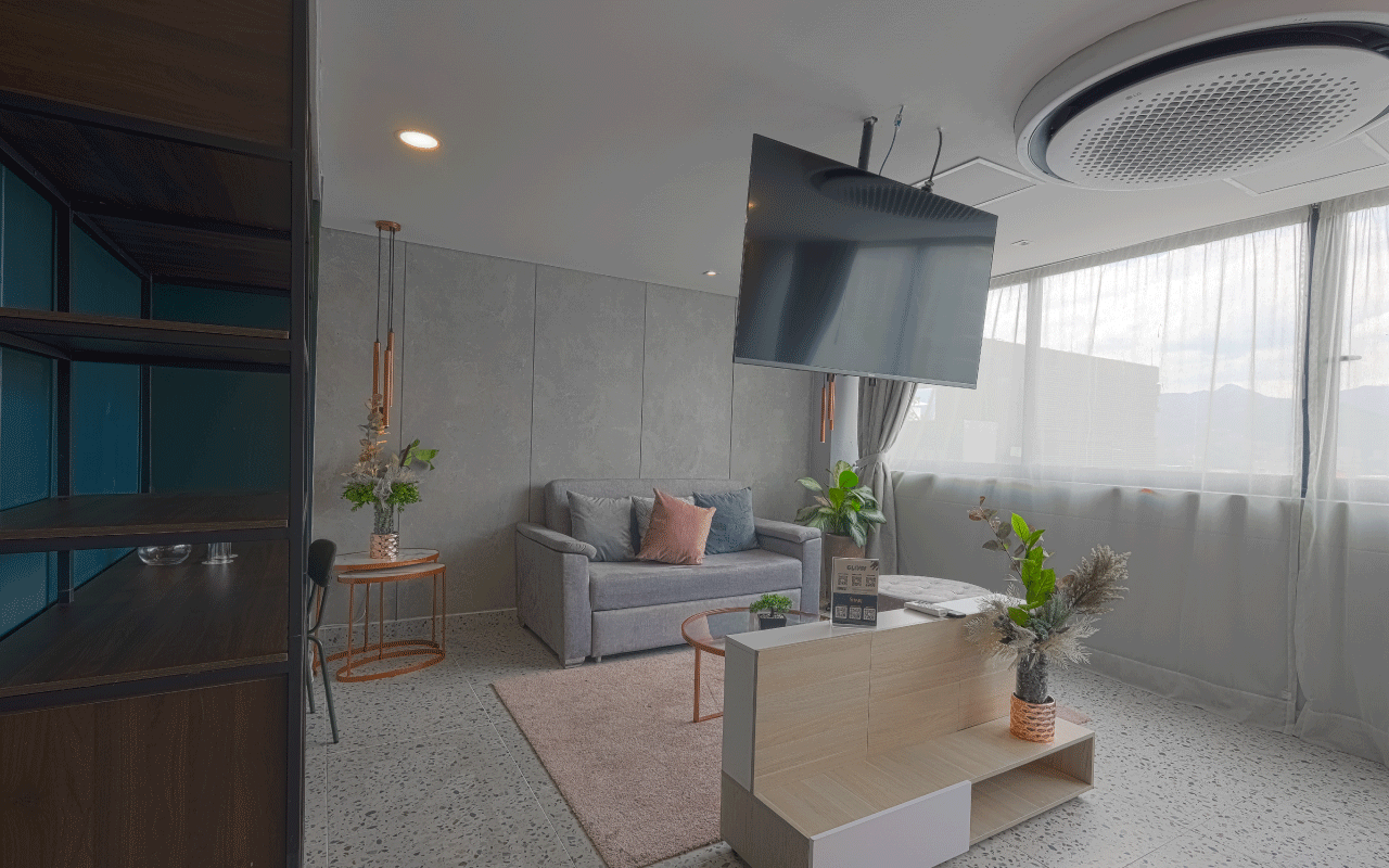Our 34 m² Junior Suite is ideal for sharing with friends, with a maximum capacity of 2 guests. It offers two semi‑double beds, a comfortable living area with a double sofa bed, a wall‑to‑wall unit with integrated desk, a bathroom featuring luxury fixtures, an ice‑glass shower, terrazzo‑style flooring, and modern finishes in vibrant colors