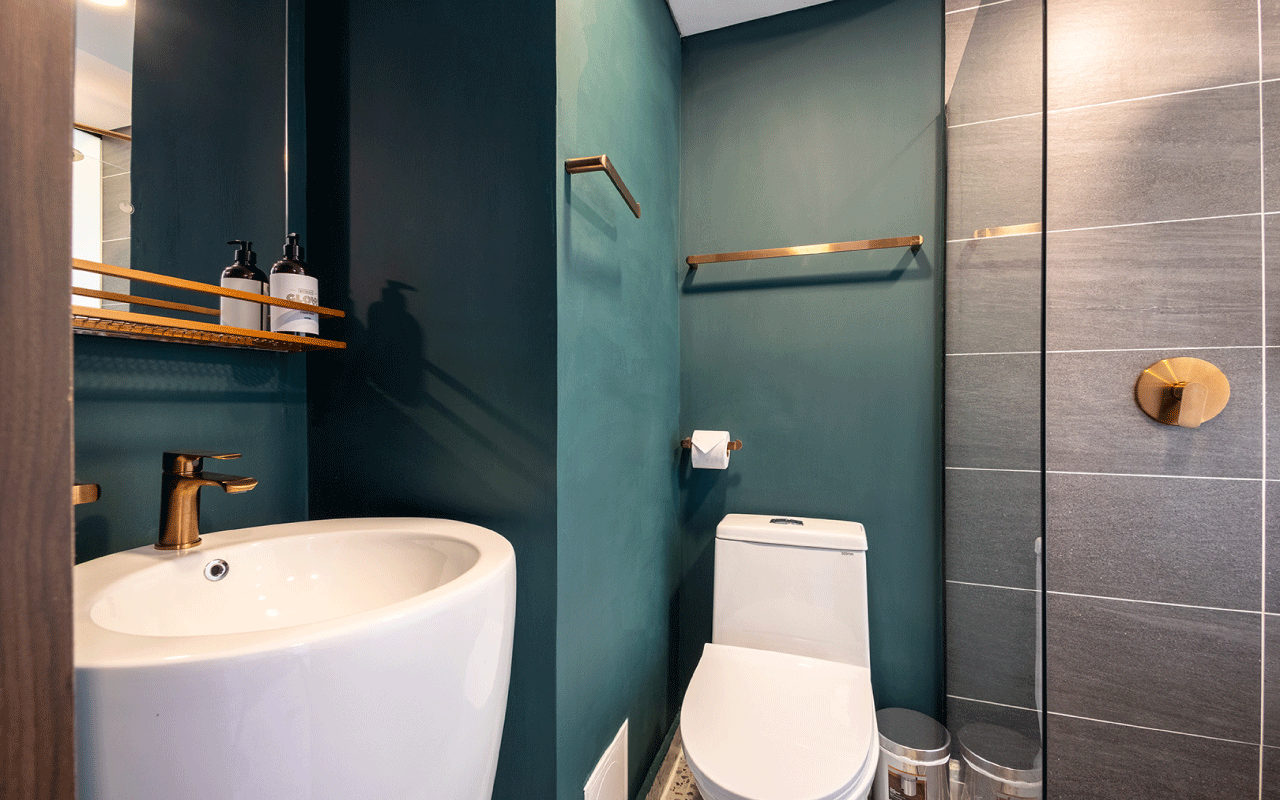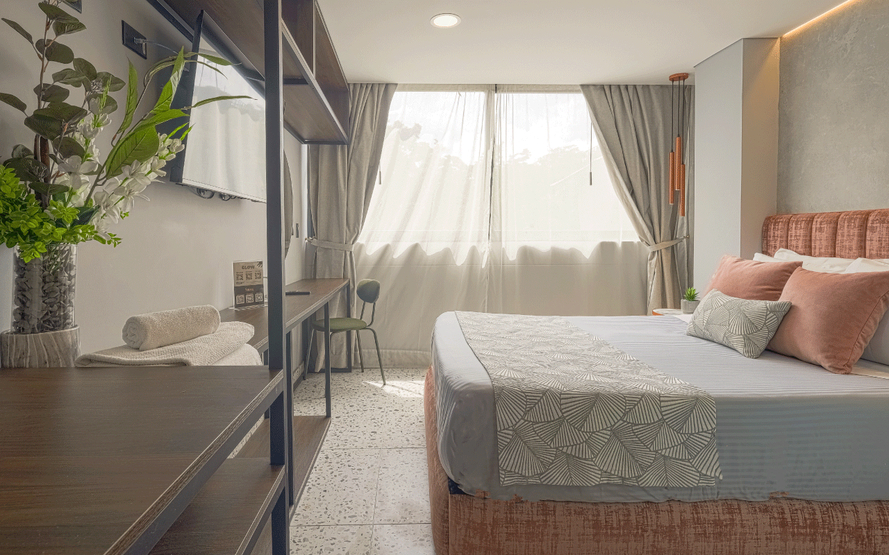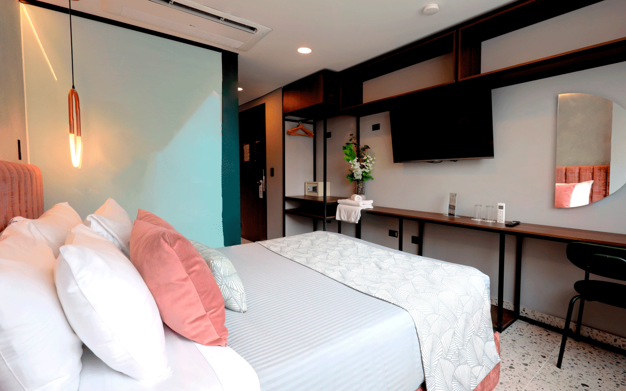 Our 15 m² Standard Room offers the perfect environment for work, combining elegance and comfort. Enjoy accommodation in a double bed, a wall‑to‑wall unit with integrated desk, a bathroom featuring luxury fixtures, an ice‑glass shower, terrazzo‑style flooring, and modern finishes in vibrant colors
