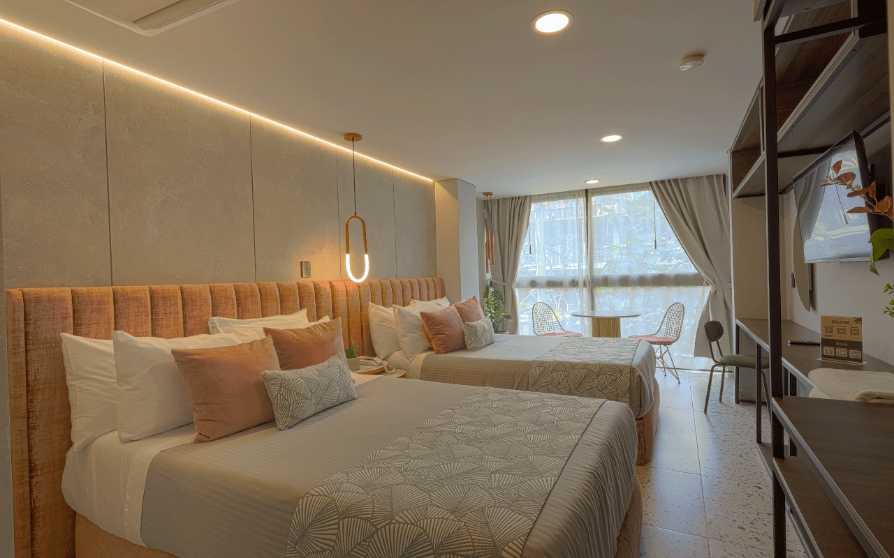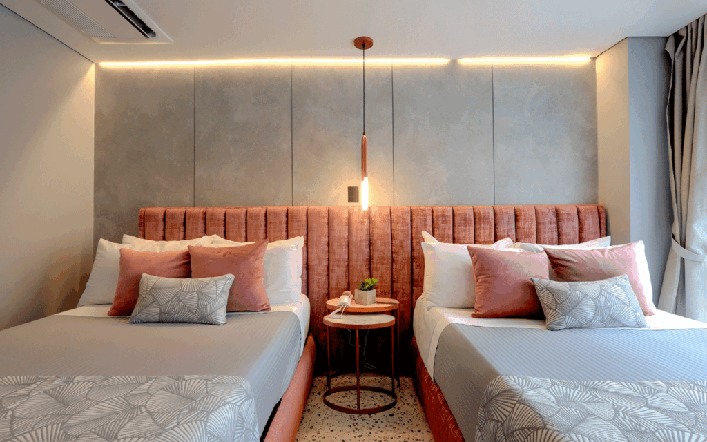 Our 22 m² Standard Twin Room provides the ideal environment for work, combining elegance and comfort. It features two semi‑double beds, a wall‑to‑wall unit with integrated desk, a bathroom with luxury fixtures, an ice‑glass shower, terrazzo‑style flooring, and modern finishes in vibrant colors